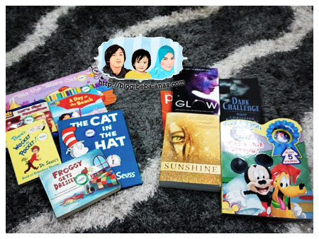 Habis RM150 gak la dok memborong buku ni..buku Alif yang Mickey Mouse tu la yang melarikan budget aku..RM29.90 satu .Maknye dapat 3 buku jek..buku2 on the right side tu beli kat Harris…but yang belah kiri tu aku beli kat bawah sekali kat LG..ade diorang jual buku 2nd hand from USA..memang murah2 jek…mostly yang aku beli tu RM3.90..ade yang RM4.90 and satu RM 7.90 tak salah aku..and condition dia memang elok lagi la..ade satu jek kot yang ade tulis nama minah saleh dalam tu..but memang kena berusaha la mencari mana buku yang murah and condition cun ni…but mostly memang ok la..takde yang buruk gile kot..